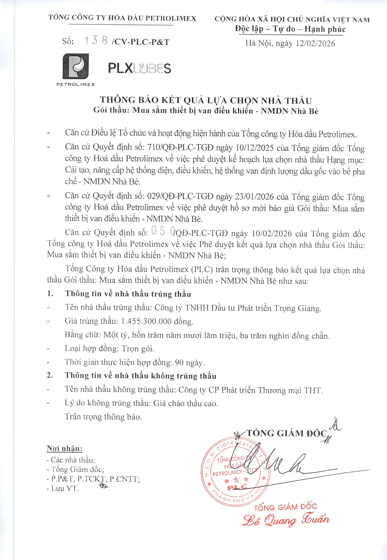 Tài liệu đính kèm:Quyết định số: 050/QĐ-PLC-TGĐ ngày 10/02/2026 Phê duyệt kết quả LCNT Gói thầu: Mua sắm thiết bị van điều khiển - NMDN Nhà Bè