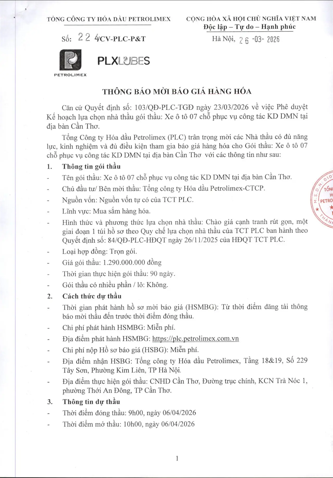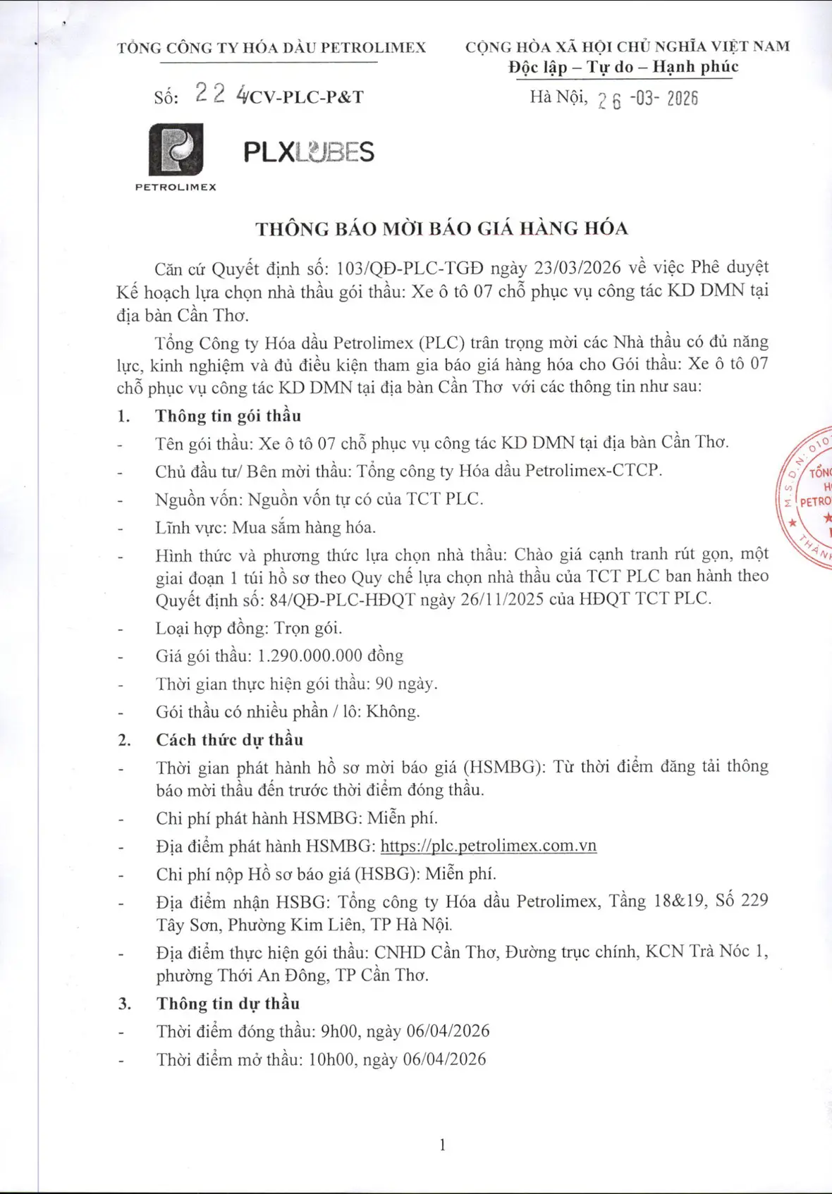 Tài liệu đính kèm:Hồ sơ mời báo giá hàng hóa Gói thầu: Xe ô tô 07 chỗ phục vụ công tác KD DMN tại địa bàn Cần Thơ.